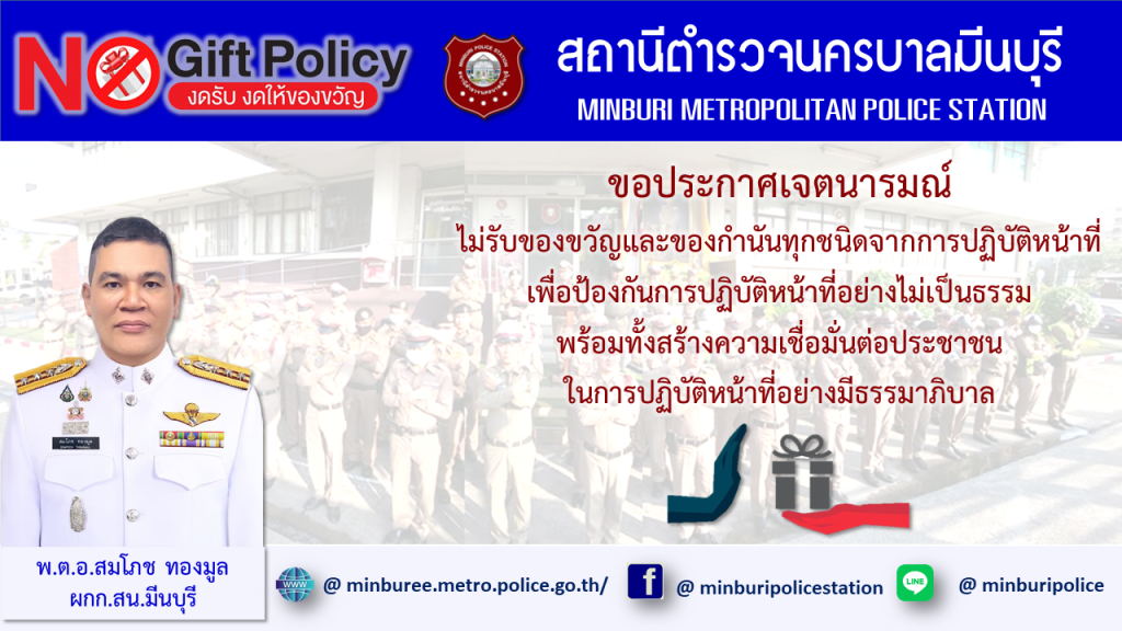 ผกก. นำข้าราชการตำรวจประกาศนโยบาย No Gift Policy 30 มีนาคม 2568 โดย admin / ข่าวภารกิจผู้บังคับบัญชา พันตำรวจเอกสมโภช ทองมูล ผกก.สน.มีนบุรีนำข้าราชการตำรวจประกาศเจตนารมณ์ ไม่รับของขวัญและของกำนันทุกชนิดจากการปฏิบัติหน้าที่ เพื่อป้องกันการปฏิบัติหน้าที่อย่างไม่เป็นธรรมพร้อมทั้งสร้างความเชื่อมั่นต่อประชาชนในการปฏิบัติหน้าที่อย่างมีธรรมาภิบาล