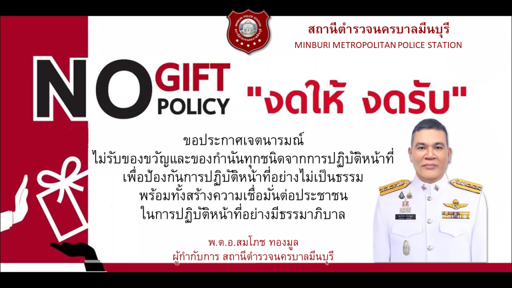 เมื่อวันที่ 4 เมษายน 2568 พ.ต.อ.สมโภช ทองมูล ผกก.สน.มีนบุรี จัดการชี้แจง การต่อต้านการรับสินบน Anti-bribery policy และการไม่รับของขวัญของกำนัลหรือประโยชน์อื่นใด No Gift Policy จากการปฏิบัติหน้าที่ ของ สน.มีนบุรี